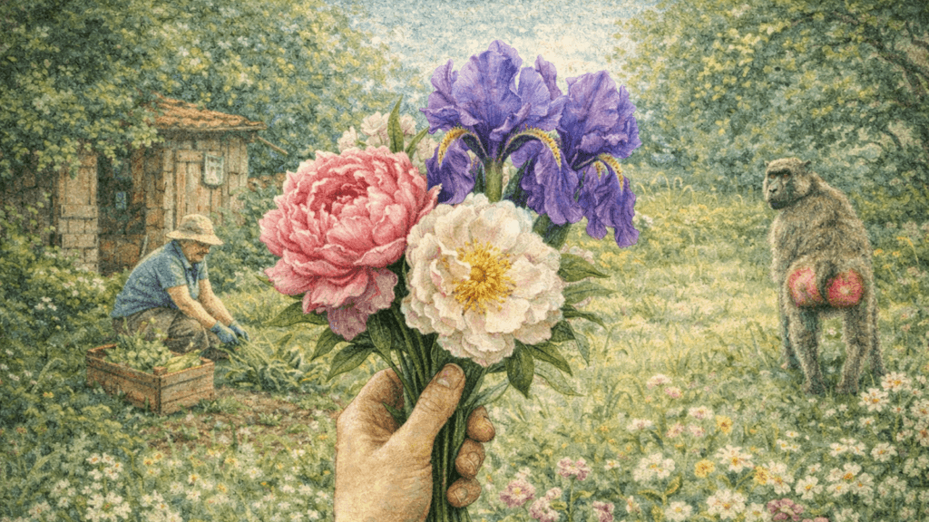 Štíhlá ruka jedné mé mladé kamarádky držela před kamerou pugét kosatců a pivoněk. Dcera ve vzrostlé trávě objevila květiny, které před půl stoletím zasadila v zahradě její máma.