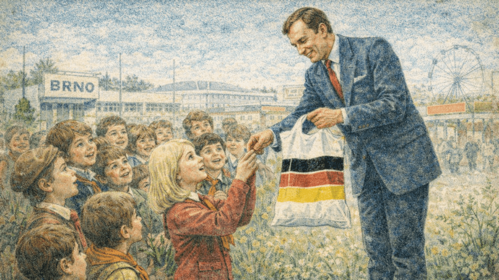 … stojí na stupínku (nebo na židli?), abychom mu nezamastili kvádro prsty upatlanými od svačiny. Vzdala jsem všechny naděje. Jsem menší než ostatní a chybí mi ochota vytrvale škemrat. Ale on se – přesto, že je strašně starý (muselo mu být aspoň třicet) – ukáže jako hotový princ. Přejíždí napjaté dychtivé tváře a pak kývne na mě. Ostatní školáci se neochotně, ale poslušně rozestoupí. Vyvolená, ohromená neobvyklým úspěchem, si nepopsatelně vděčně odnáším – igelitovou tašku! Byla měkoučká, bílá, s třemi jasně zářícími pruhy v barvách Západního Německa.